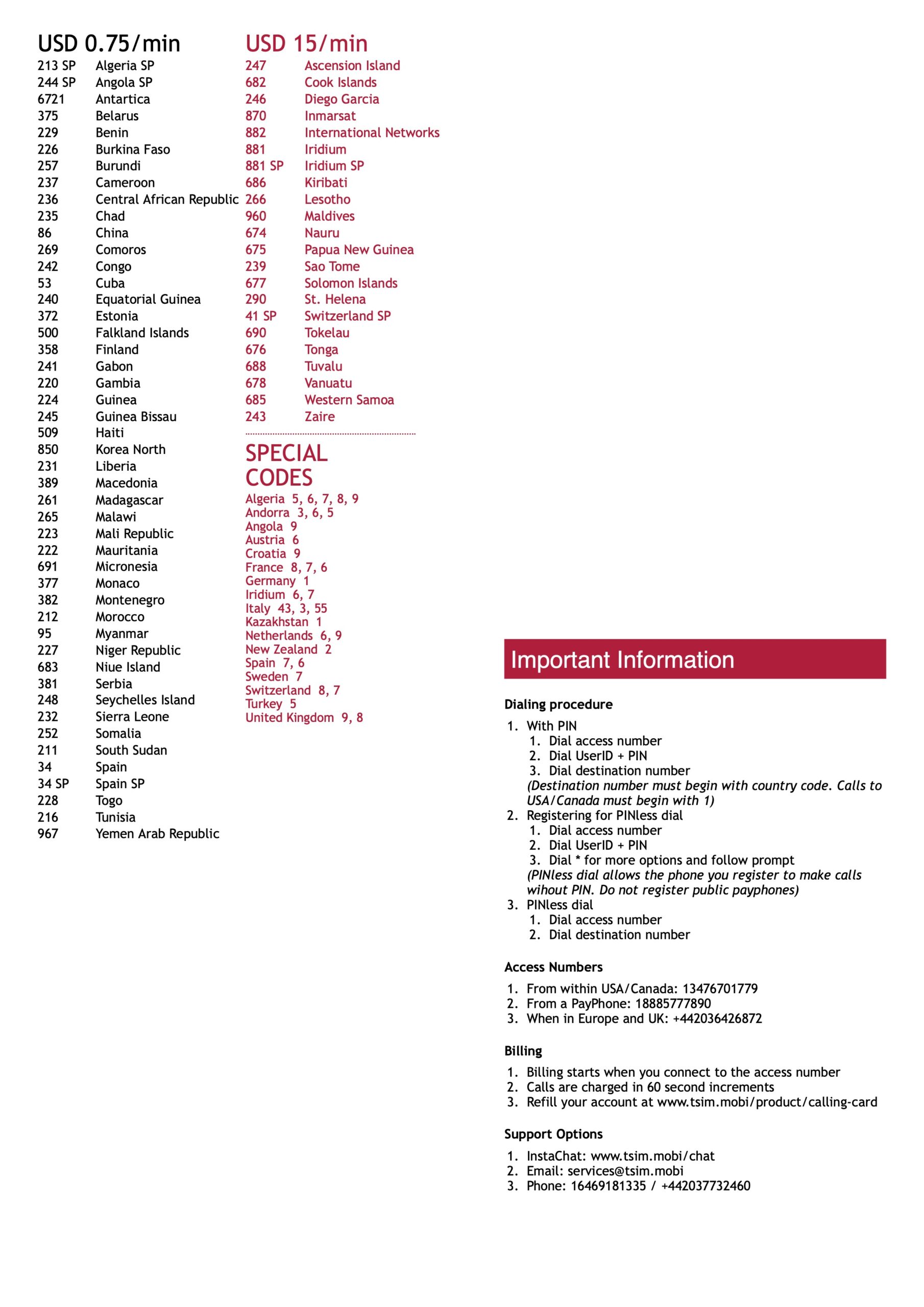 SIMPLE DIALING PROCEDURE: Dial any access number, when prompted dial PIN and destination number. PINless dialing possible by registering calling number. Destination number must include country code. Calls to USA/Canada must begin with 1. Upto 500 minutes available depending on destination slab. Calling mobiles in some countries gives you less minutes. See slabs in images.